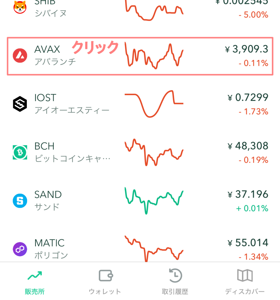 メニューから「販売所」を選択し、取り扱い通貨の一覧から「AVAX」を選びます。