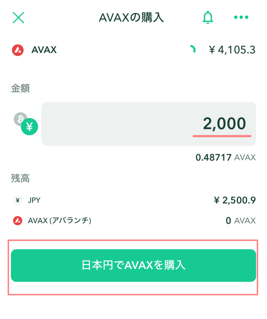 購入したいAVAXの数量を入力します。日本円での購入金額を入力することも可能です。