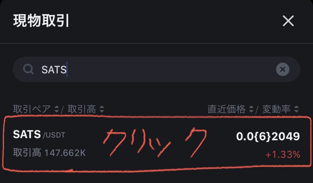 次に、検索バーで「SATS」を入力し、「SATS/USDT」のペアを選択します。