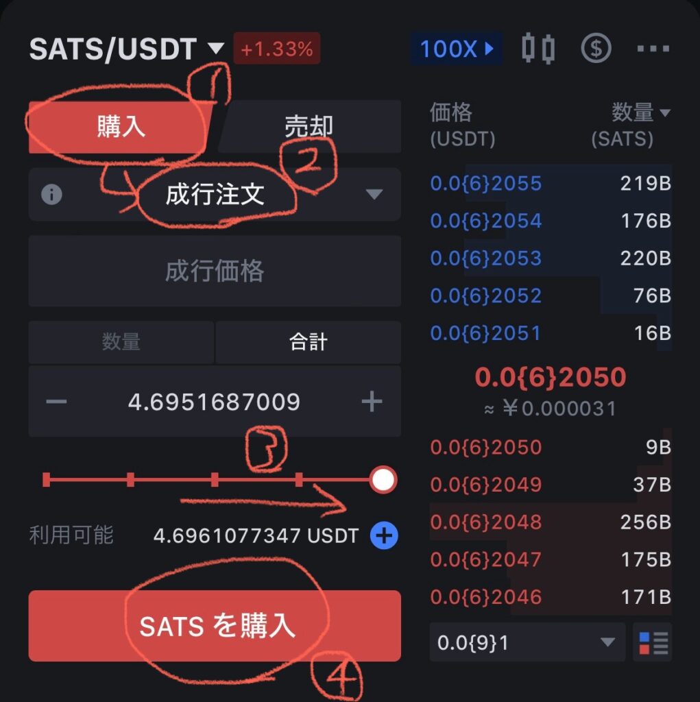 購入→成功注文の順で選択し、取引画面で購入したい数量のSATSをスライドか入力し、USDTで購入を完了させます。