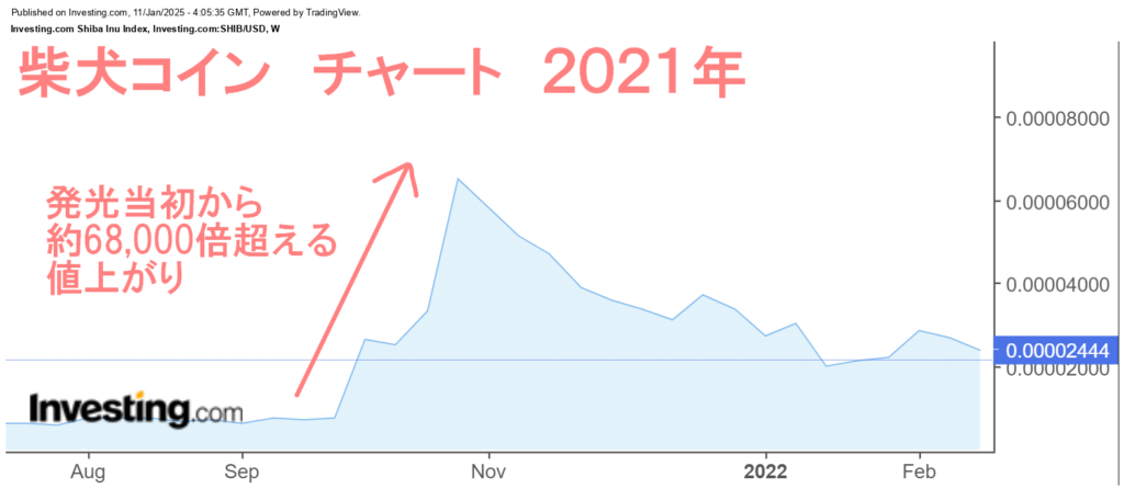 柴犬コインが登場したのは2020年8月、初期価格は驚くほど低く、1SHIB=約0.000000000145ドルでした。