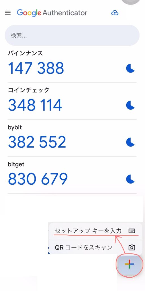 Google Authenticatorを開いたら、右下のプラスボタンを押し、セットアップキーを入力をクリックします。