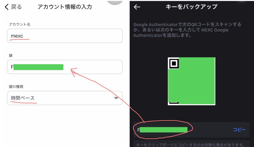 これを以下の画像を参考にGoogle Authenticatorにキーを登録していきます。